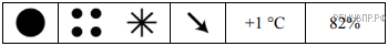 На данной схеме представлены основные характериктики погоды: облачность (ясно, переменная облачность, сплошная облачность), осадки (снег, дождь, туман, роса, град), направление ветра (по сторонам горизонта), средняя температура (в градусах С°) и влажность воздуха (в %).